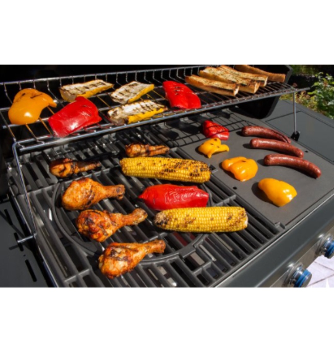 • Grelhador a gás com vários alimentos a grelhar, como frango, milho, pimentos, salsichas e pão