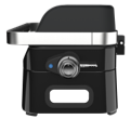 • Grelhador portátil preto com detalhes prateados e indicador de temperatura