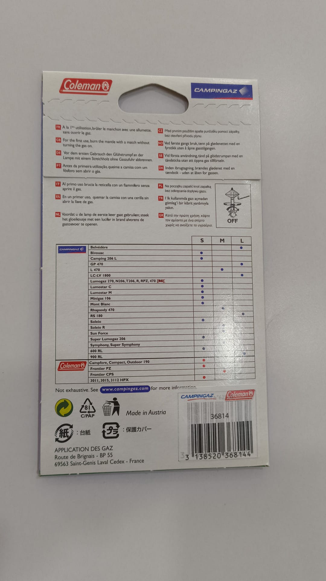 CAMISAS PARA CANDEIRO CAMPINGAZ (3UN) Tamanho L 8,40 € Desconto de %. IVA incluído. Partilhar Comprar Contactar SKU: 36814 Carateristicas: Contém um pacote de 03 camisas. Material protegido sem amianto e não é radioativo. Tamanho: L Marca Campingaz Características