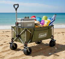 • Carrinho de praia dobrável Coleman com cooler e utensílios na areia junto ao mar