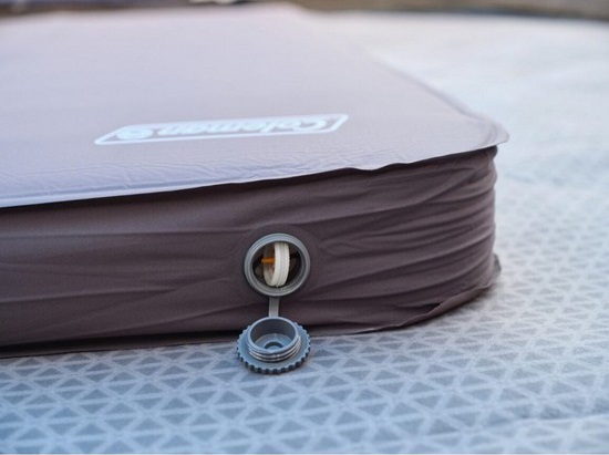 • Colchão insuflável castanho escuro com válvula prateada num tapete cinza claro