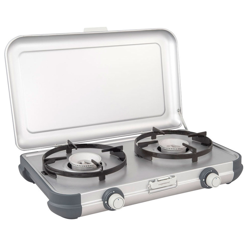 Descrição A Camping Kitchen® 2 é o perfeito fogão-companheiro para qualquer passeio em família, tanto seja um passeio de fim-de-semana como um passeio de estadia mais prolongada. Este é um fogão de dois queimadores, leve e fácil de transportar. O design elegante, com punho de transporte incorporado, permite poupar em termos de ocupação de espaço, quando arrumado no seu carro ou caravana. A Camping Kitchen® 2 incorpora igualmente painéis laterais, resistentes ao calor, suportes para panelas em aço esmaltado que servem simultaneamente de corta-vento. Uma vez terminada a sua refeição, pode remover facilmente os suportes de panelas para uma limpeza rápida e fácil. Características chave do produto: Tampa de aço robusta, com trava em Aço. Manípulos de carregar / rodar para controlo completo da chama. Suportes de panelas em aço esmaltado, que podem ir à máquina de lavar louça. Painéis laterais resistentes ao calor, com pega de transporte. Uma base ampla para maior estabilidade. Capacidade para 2 panelas de 24 cm ø.