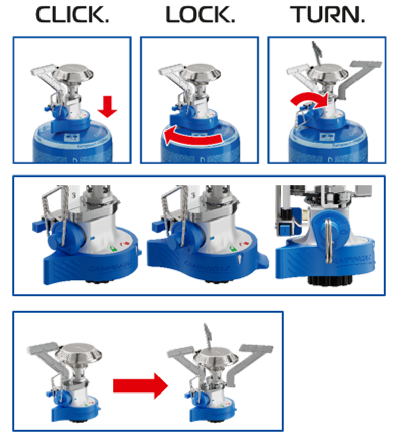 • Instruções para montagem de fogão portátil a gás azul com três passos e setas vermelhas.