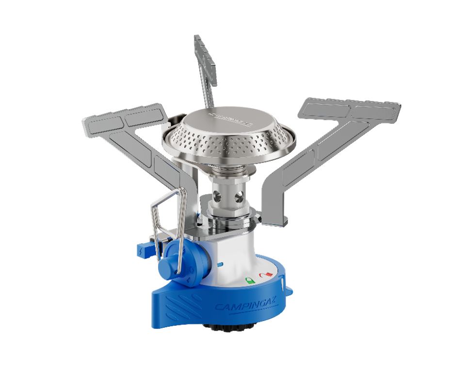 • Fogão portátil de campismo metálico com detalhes em azul