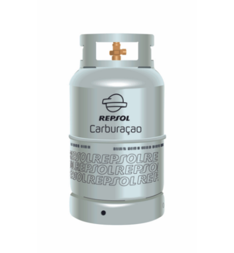 Botija de gás cinzenta com logótipo Repsol e texto Carburação