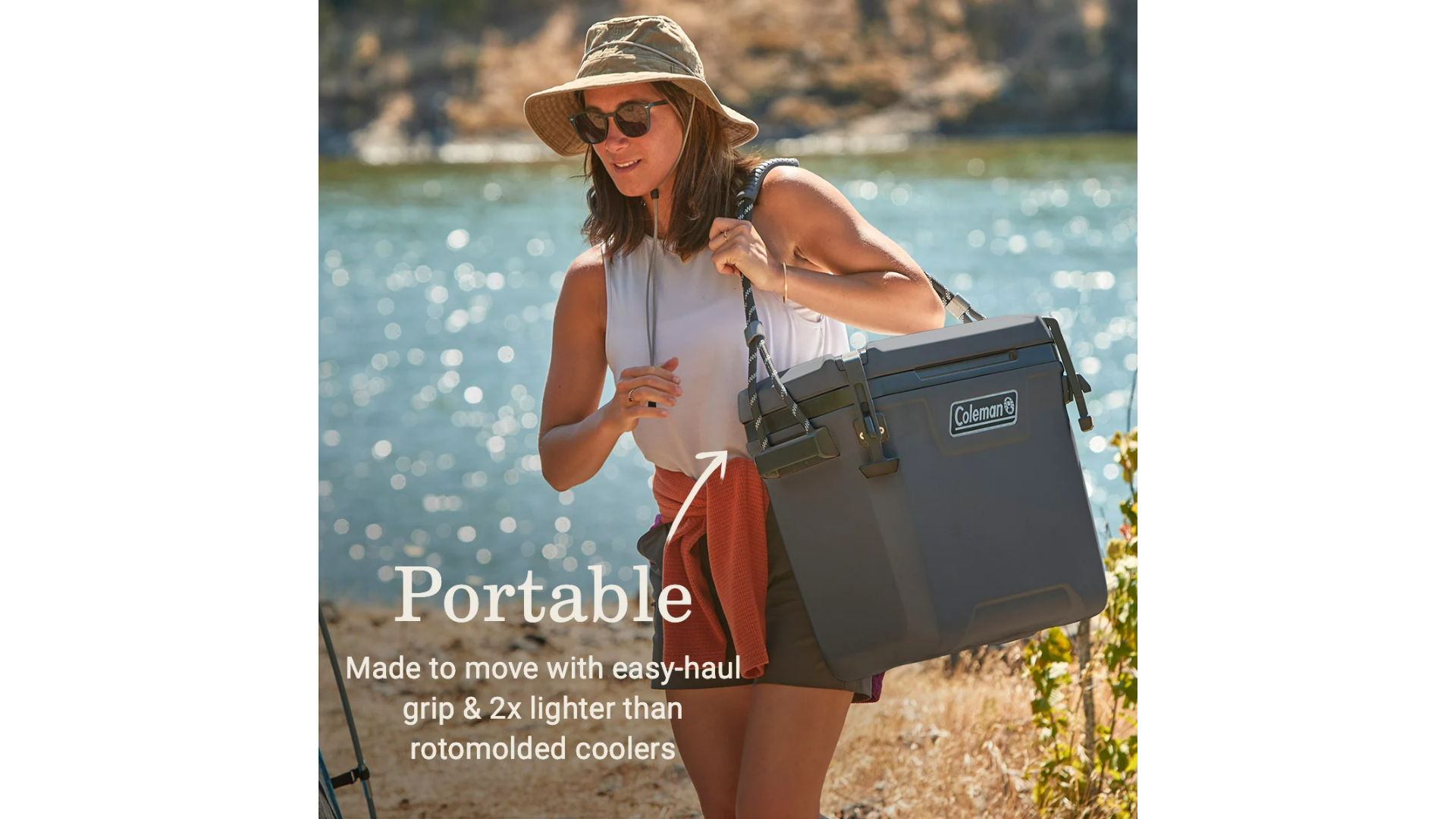 • Mulher a carregar cooler Coleman cinzento junto a rio