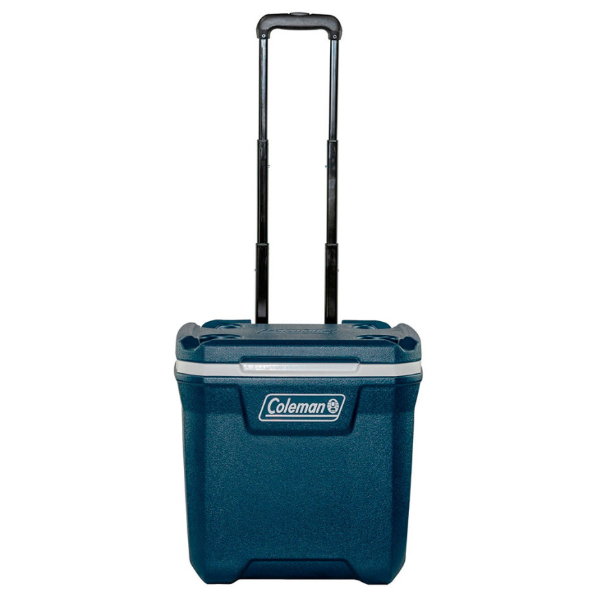 • Contentor refrigerante Coleman azul escuro com tampa aberta e rodas