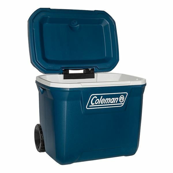 • Caixa térmica azul escuro Coleman com tampa aberta e rodas