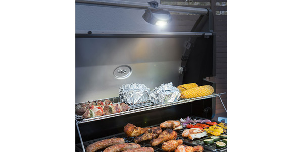 A luz é colocada na pega do barbecues para proporcionar uma luz distribuída de forma uniforme sobre toda a superfície de cozedura permitindo uma boa visão em toda a area de cozinhar.