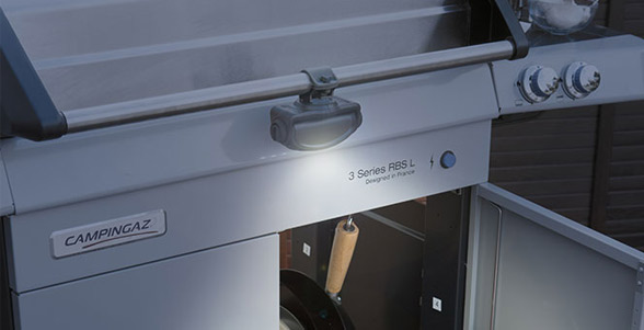 • Grelhador a gás CAMPINGAZ 3 Series RBS L aberto com luz acesa