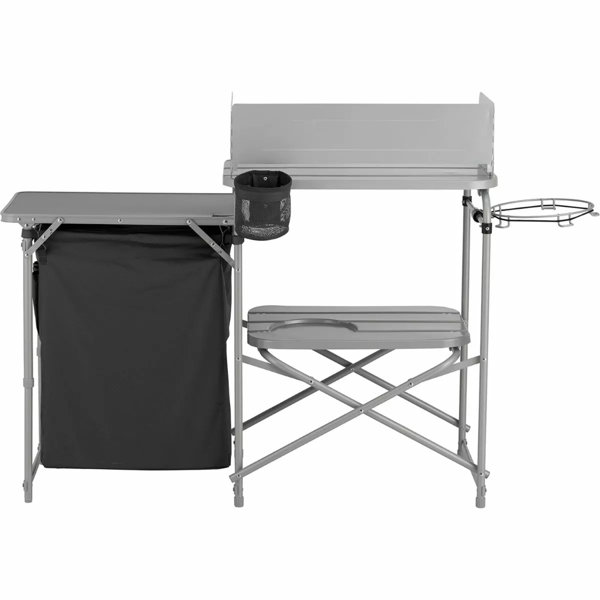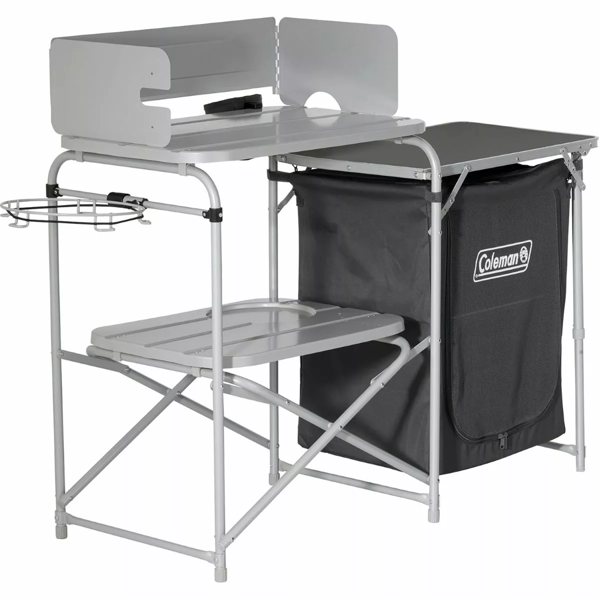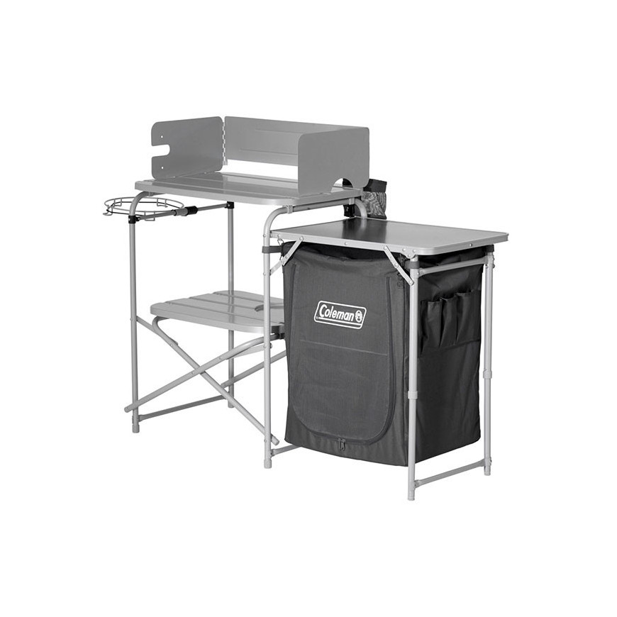 Móvel de cozinha portátil Coleman com estrutura metálica cinza e tecido preto.