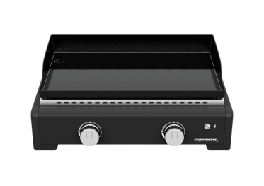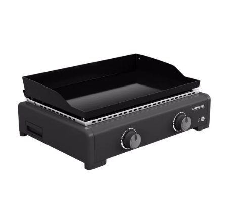 • Chapa de cozinha preta Campgaz com duas zonas de controlo e superfície lisa de ferro fundido