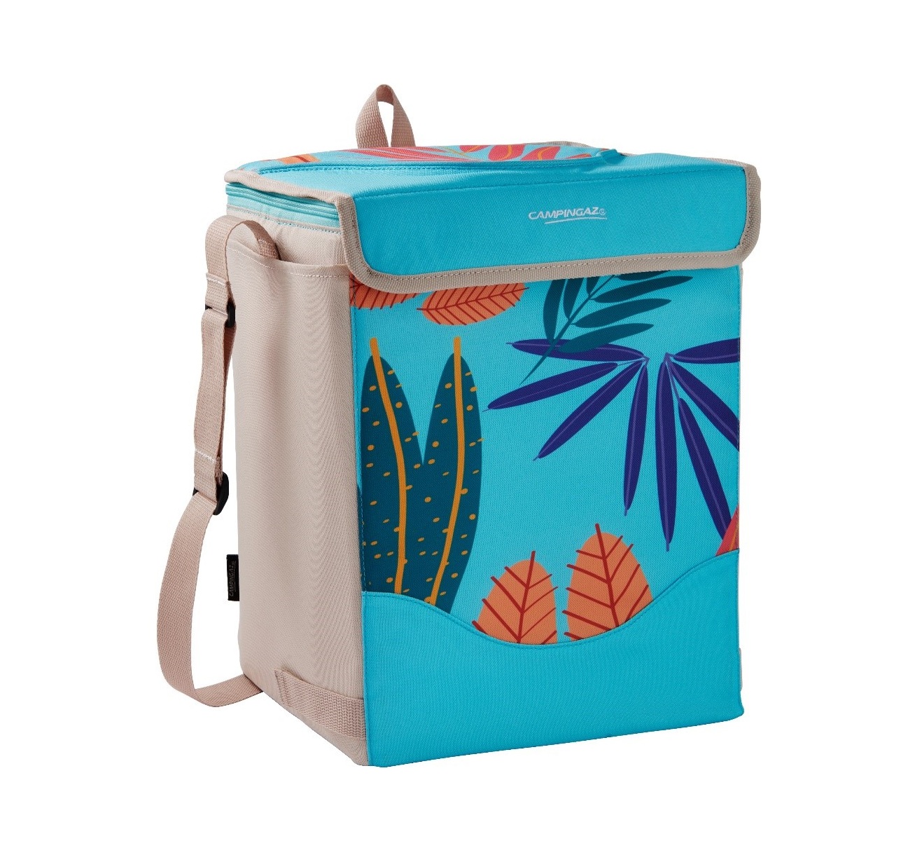 • Mala térmica azul com padrão de folhas coloridas e alça bege