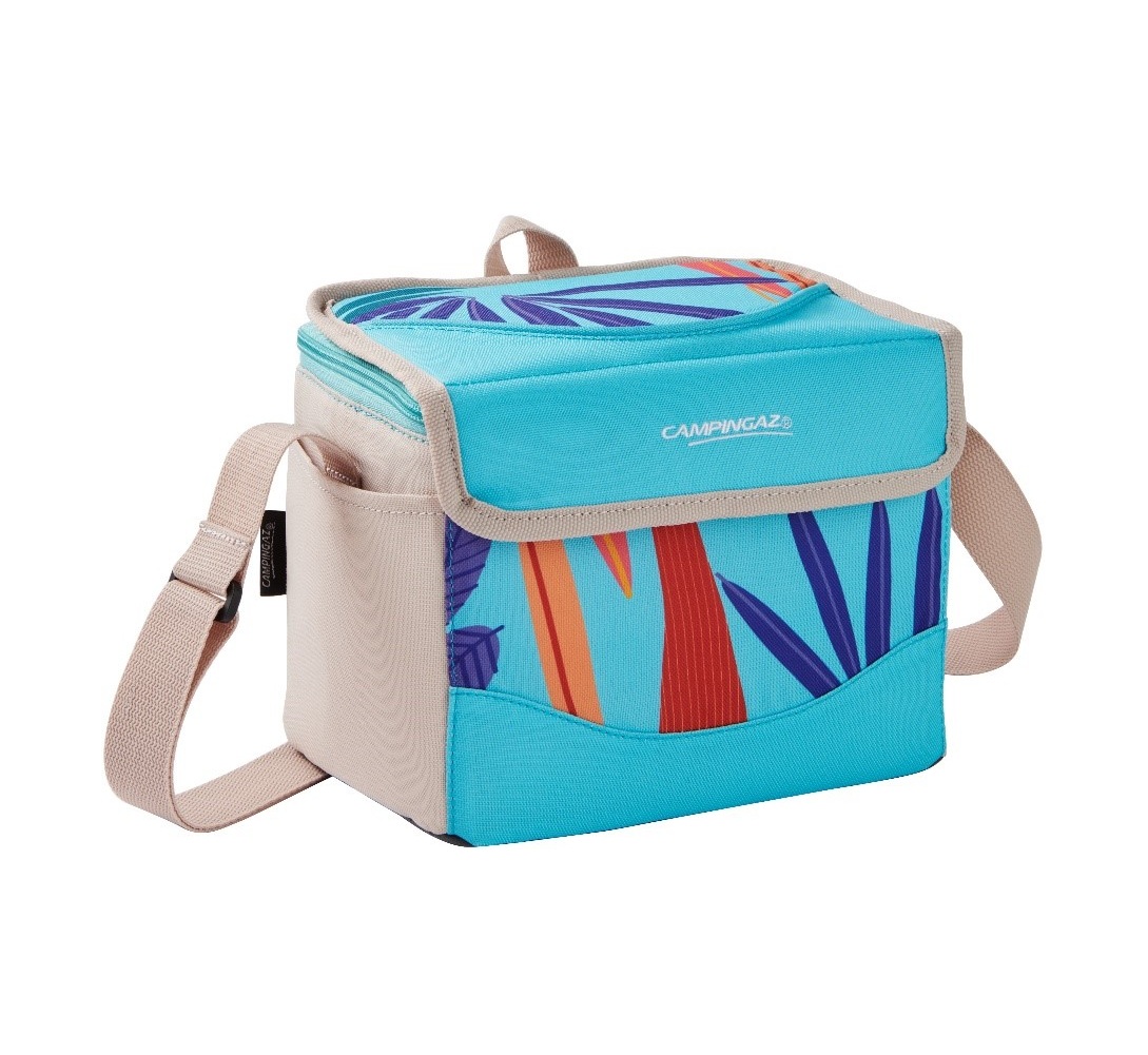 • Bolsa térmica azul com padrões de folhas coloridas e alças bege